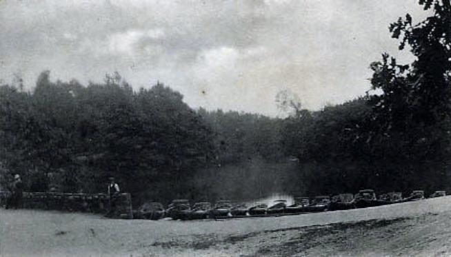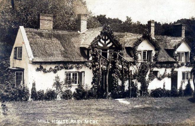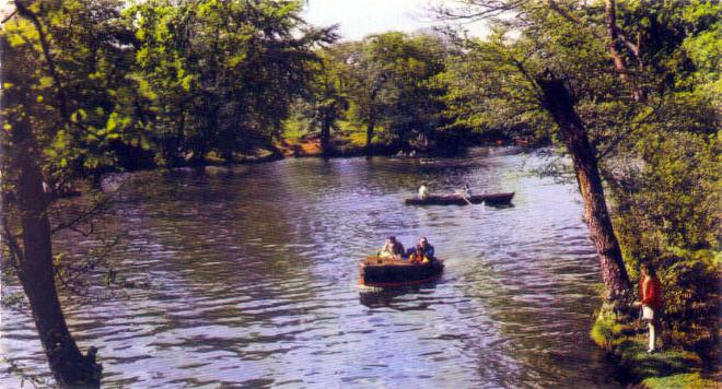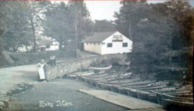 Rowing Boats lined up at the edge of the Mere. In the background can be seen the Mill House Tea Gardens. |