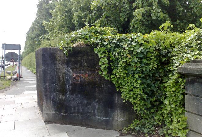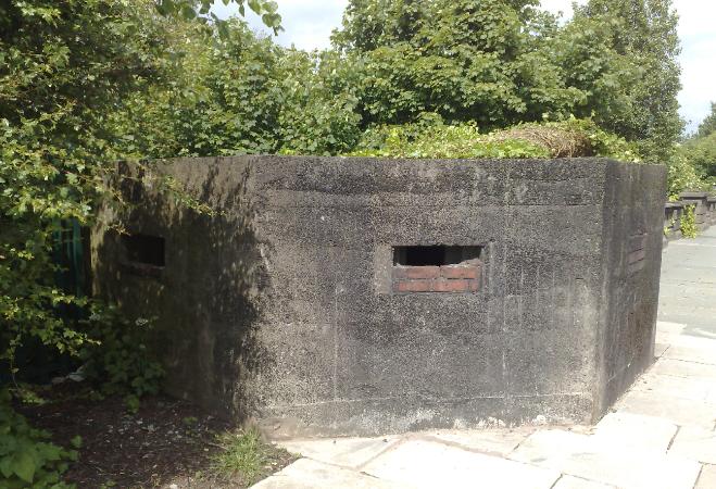 The concrete pillbox at Bromborough Pool was built to defend Thomas Brasseys New Chester Road. It is just one of many defences set up around Wirral in case of an airborne invasion from the Germans during WW2. Two pillboxes occupy the high ground and were built on either side of the road to allow for a deadly arc of fire for any approaching vehicles.