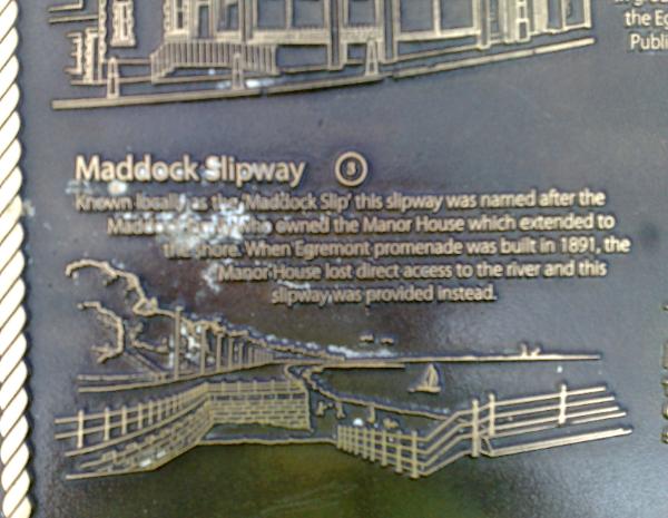 | Egremont's Maddock Slipway Plque - Inscription as follows: "Known locally as the Maddocks Slip, this slipway was named after the Maddock family who owned the Manor House which extended to the shore. When Egremont promenade was built in 1891, the Manor House lost direct access to the river and thsi slipway was provided instead". |